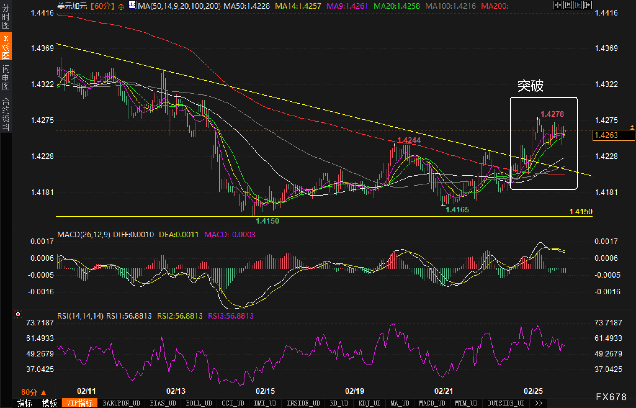 从技能面来看,好意思元/加元的走势在近期呈现震憾整理的地方。现时价钱在1.42凹凸波动,形成了一个明显的区间震憾。跟着特朗普计谋言论的捏续发酵,阛阓的不坚信性加重,短期内可能仍会看护在这一限制内波动。
