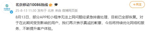 新京报讯 据@北京出动10086热线 音书,8月13日,部分APP和小技巧无法上网问题经膺惩排查处置,当今已统共规复。关于在此时间受到影响的用户,再次暗示诚笃的歉意,今后将执续优化相聚和处事,不断进步客户体验。