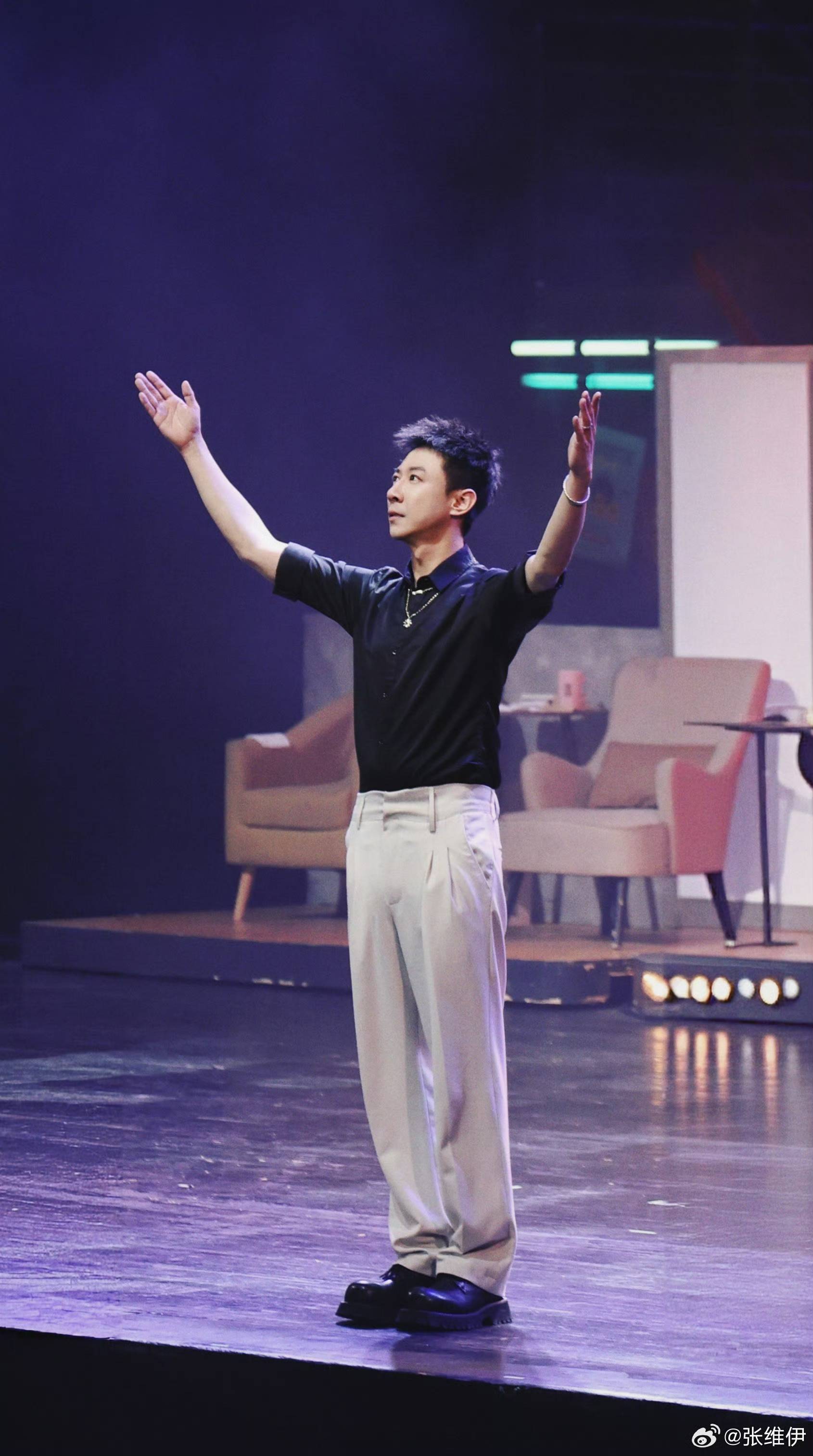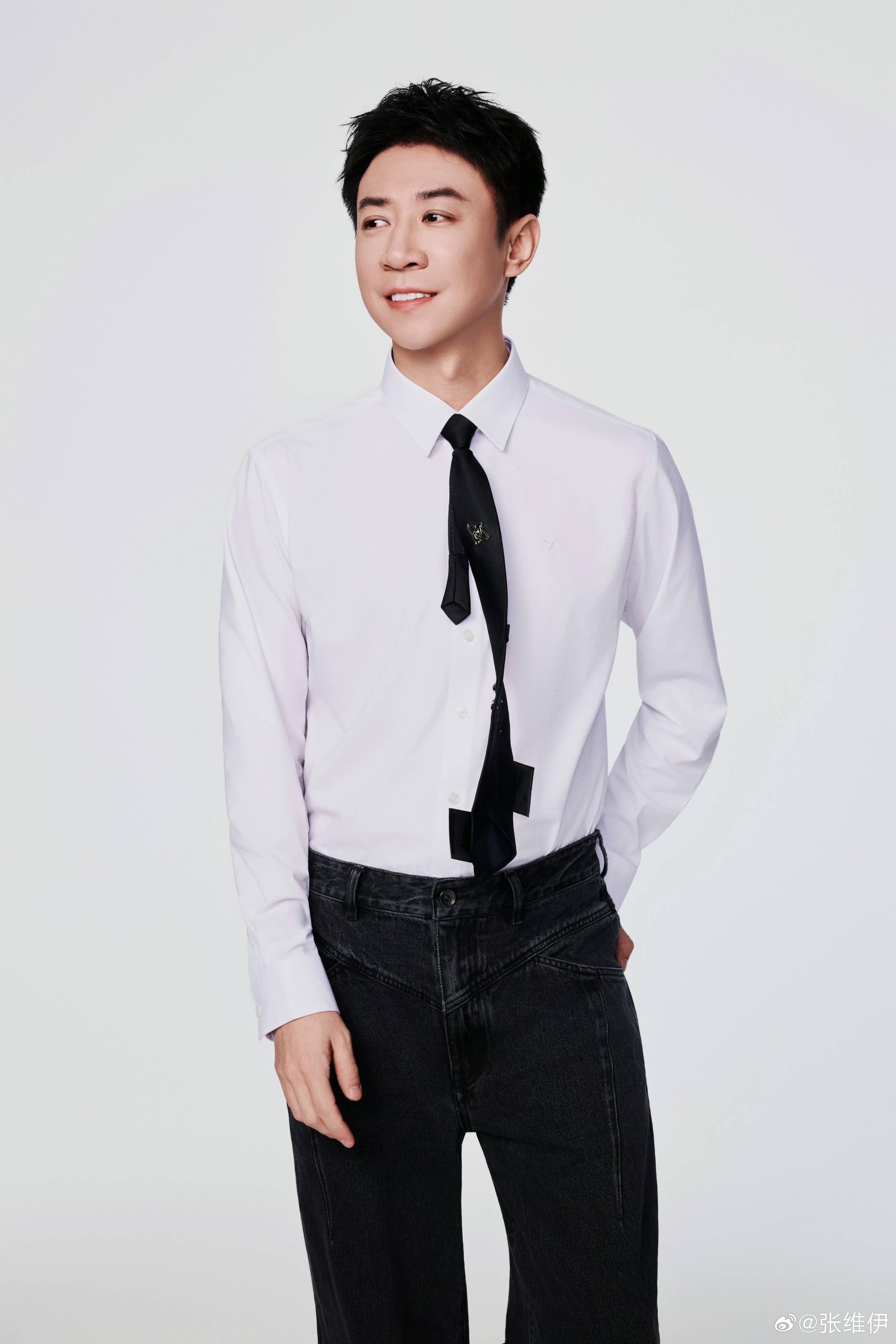 张维伊还稀奇拍了诞辰鏖战,他穿白色衬衫、玄色牛仔裤,松驰的打着领带,单手插兜的格式很帅气。