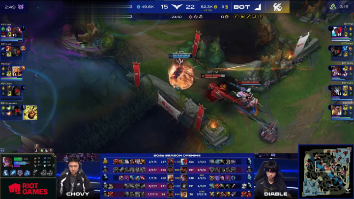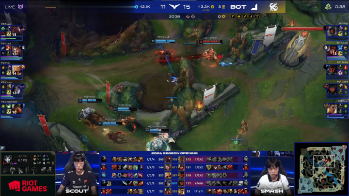 比赛第13分钟,Peyz永恩起程一打二反杀Scout杰斯,下路队打出0换2后一度获得前期上风。