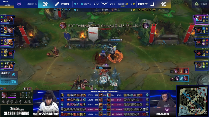 比赛第20分钟,Faker塞恩绕后持到Diable烬,中单队一波拿下大龙。
