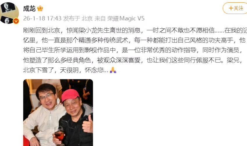 功夫据说摈弃2026年1月14日凌晨,梁小龙在家东说念主的奉陪下突发急病离世,享年77岁。