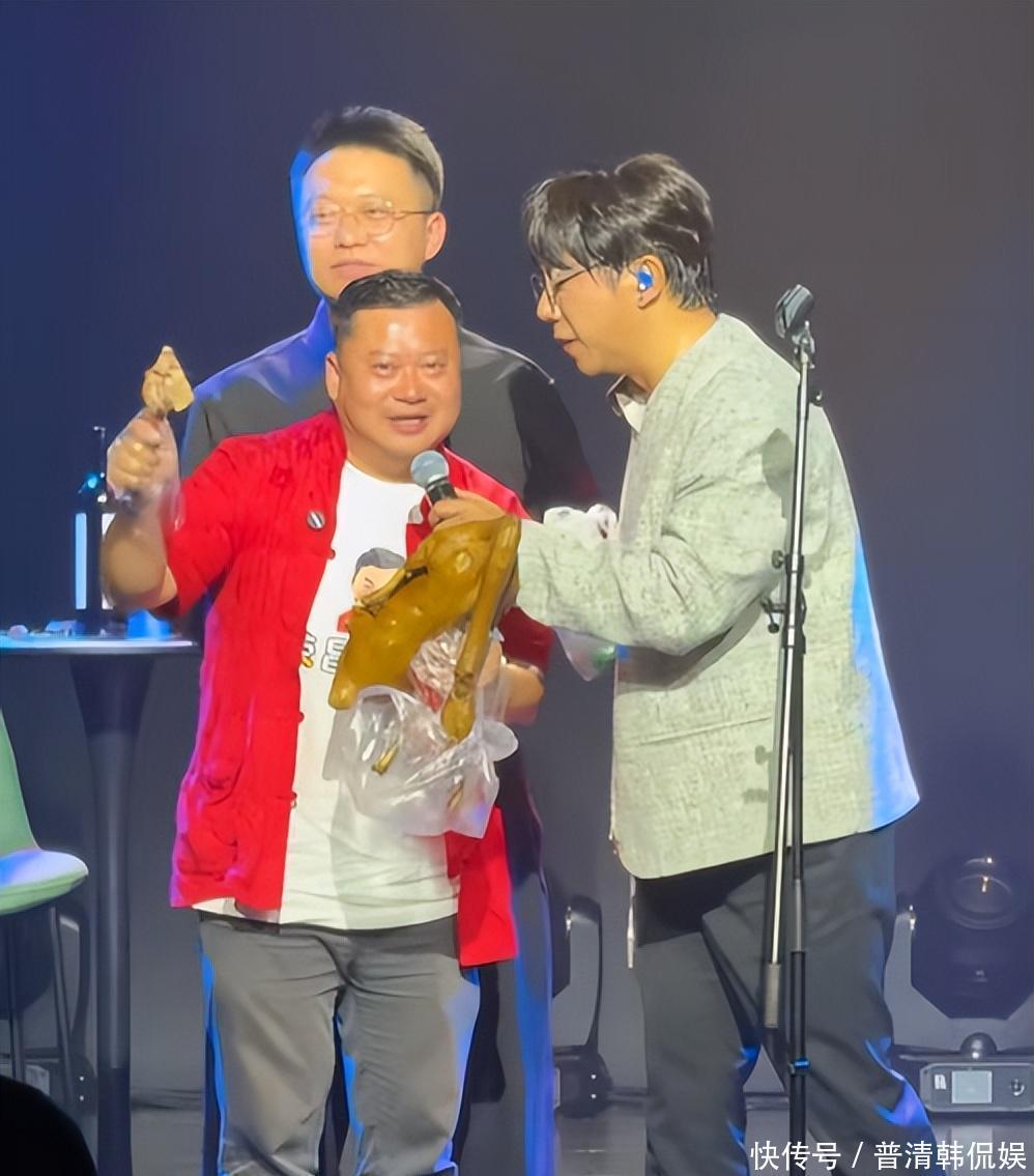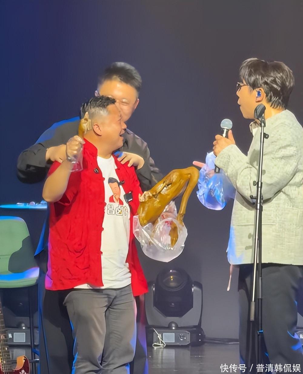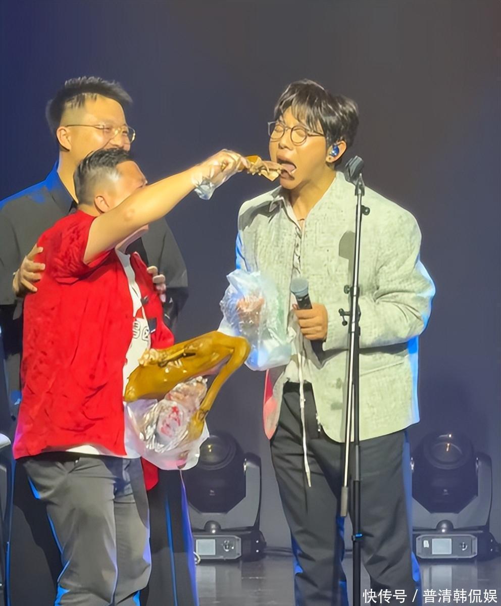 只见他提着记号性大袋子冲上舞台,徒手撕开热腾腾的卤鹅,径直把鹅腿塞到海泉嘴边。海泉被香得连连点头,台下不雅众皆喊"我也要吃",地方一度“失控”!