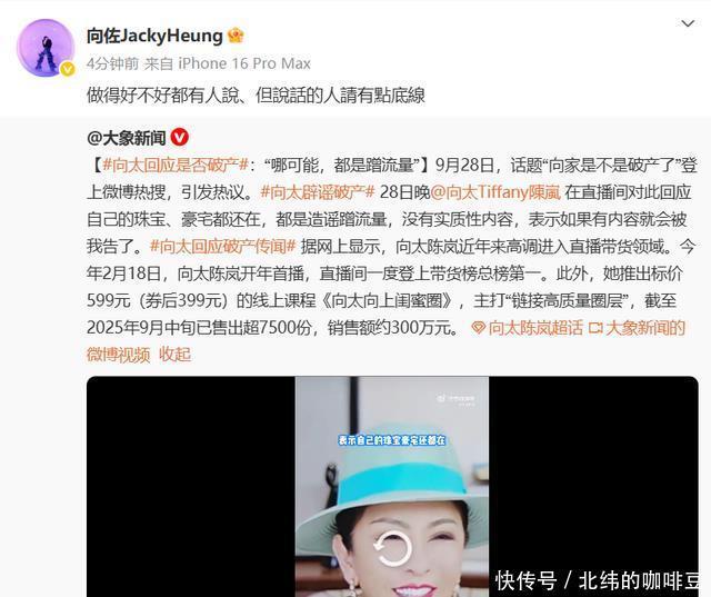 9月28日,话题 “向家是不是停业了” 登上微博热搜,激勉热议。 28日晚,向太陈岚在直播间回报停业传奇。 她称刻下养着1000多名职工,我方的珠宝、豪宅齐还在,齐是斥责蹭流量。 向太示意,传奇莫得本体性内容,“要是有内容就会被我告了”。