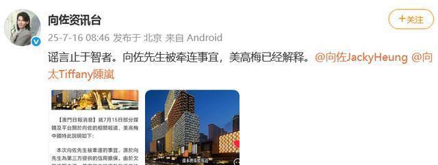本年7月,向佐被曝欠赌债百万未还。 7月15日,向佐牙东说念主回报示意:“向佐本东说念主莫得参与赌博!是一场扭曲!但愿群众看重自我,隔离赌博,你认为向家差那点钱吗?” 7月16日,针对向佐被曝欠赌债百万未还的音尘,向佐责任室发文回报。