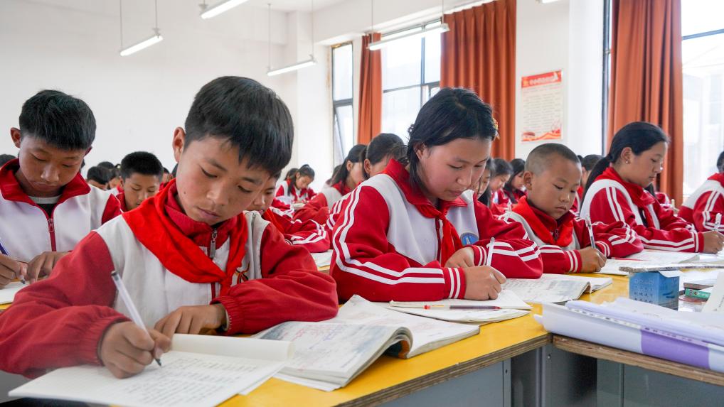 4月21日,四川省凉山州昭觉县城北镇沐恩邸中心小学学生在课堂上写功课。(新华社记者尹恒摄)