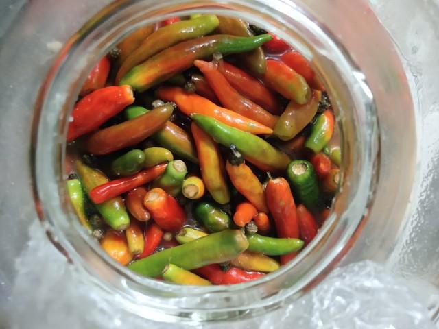 3. 辣椒+姜蒜装入无油无水瓶,倒入凉料汁密封,腌2天即可。