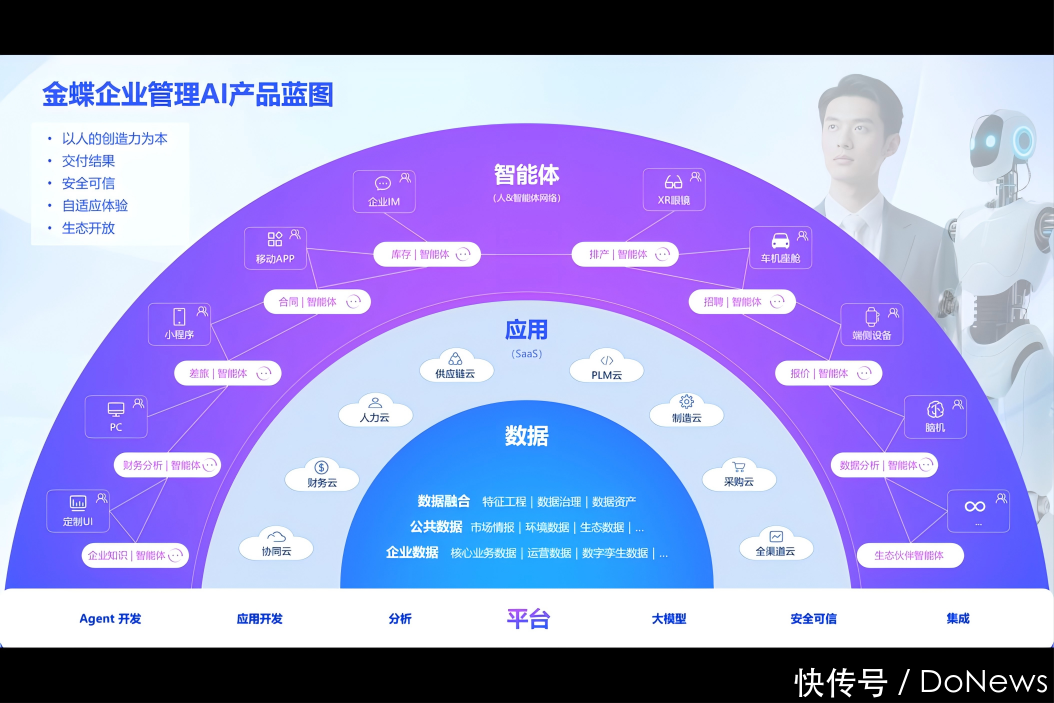 领先,咱们来看一张图,这是金蝶发布的AI产物蓝图。图中的半圆主要分红了三层,中间一层是哄骗,也即是SaaS,这是金蝶昔时十余年的蓄积,而最外一圈的智能体(Agent),则代表着畴昔的所在。