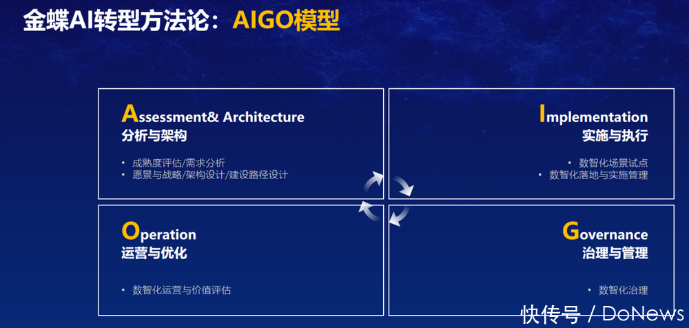 关于思要鼓吹这件事的企业,大会现场金蝶还推出了AI转型智力论“AIGO”:A(Assessment& Architecture,分析与架构)、I(Implementation,实施与彭胀)、G(Governance,治理与束缚)、O(Operation,运营与优化)。